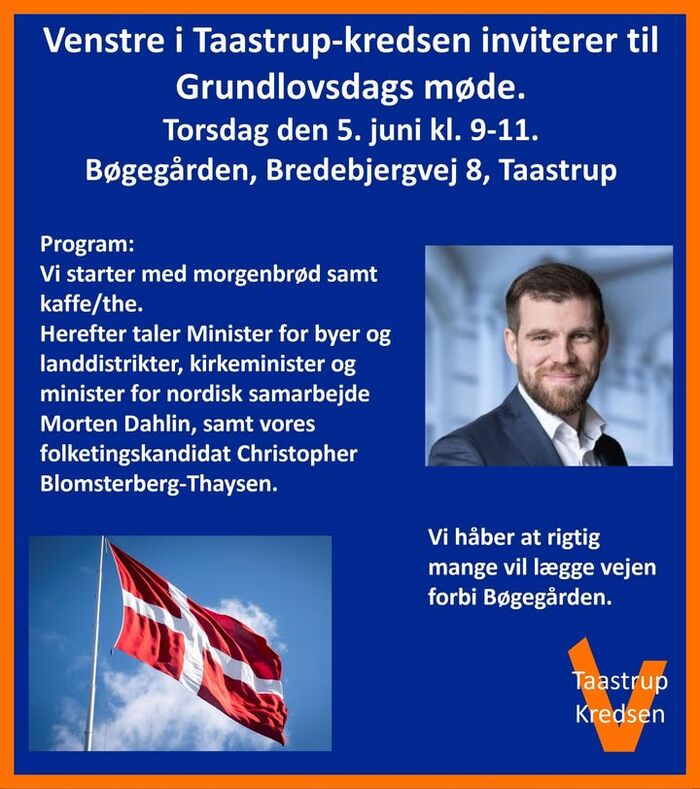 Grundlovsmøde i Taastrup kredsen i fint vejr. Taler af Morten Dahlin og vores folketingskandidat Christopher Blomsterberg-Thaysen. Begge talere mente at det er vigtigt ikke at tage vores frihed for givet.